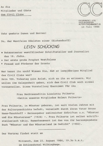 - Diavortrag: Drostefreund Levin Schücking. 1984 beim Civilclub im Barockzimmer Schloß Wilkinghege.